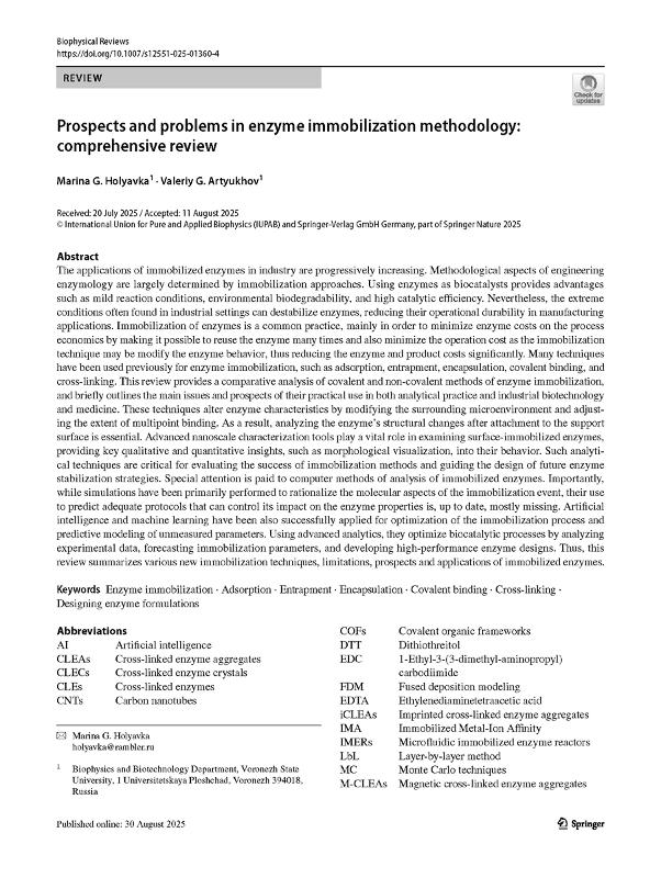 Первая статья, «Prospects and problems in enzyme immobilization methodology: comprehensive review», подготовленная профессором Мариной Холявка и заведующим кафедрой Валерием Артюховым, представляет собой сравнительный анализ различных техник иммобилизации. Особое внимание в работе уделено роли передовых методов анализа и компьютерного моделирования иммобилизованных систем, включая искусственный интеллект и машинное обучение, для прогнозирования и оптимизации процессов стабилизации ферментов.