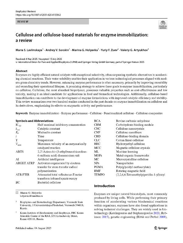 Вторая работа, «Cellulose and cellulose-based materials for enzyme immobilization: a review», написана в соавторстве старшими научными сотрудниками Марией Лавлинской и Андреем Сорокиным, профессором Мариной Холявка, заведующим кафедрой Валерием Артюховым и их коллегой из Казанского института биохимии и биофизики Юрием Зуевым. В этом обзоре систематизированы результаты более двухсот исследований за последнее десятилетие, посвящённых использованию целлюлозы – самого распространенного полисахарида – в качестве перспективного, нетоксичного и экономически доступного носителя для иммобилизации ферментов.