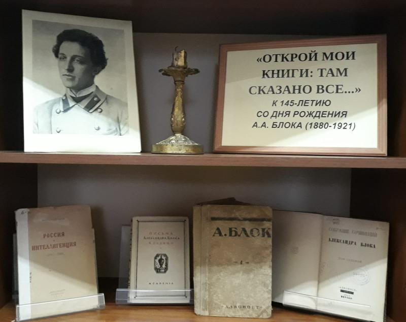 В Отделе редких книг работает выставка: «Открой мои книги: там сказано все...», посвященная 145-летию со дня рождения Александра Александровича Блока (1880–1921). На ней представлены прижизненные издания поэта, номера журналов, с которыми сотрудничал А.А. Блок, письма родным, прижизненные публикации о творчестве о его творчестве.