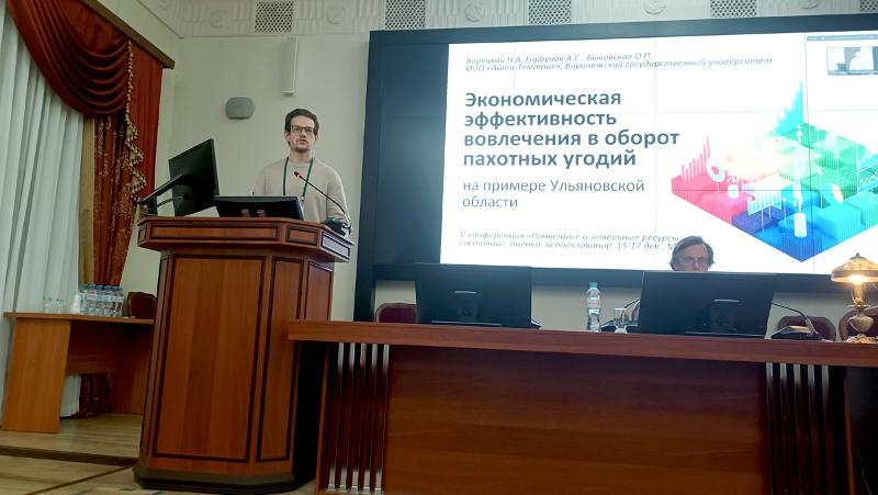 В работе конференции активное участие приняли сотрудники кафедры физической географии и оптимизации ландшафта факультета географии, геоэкологии и туризма преподаватель Никита Александрович Корецкий, доцент Анатолий Станиславович Горбунов и заведующий кафедрой Ольга Петровна Быковская. Ими был представлен коллективный научный доклад, подготовленный совместно с многолетним партнером Воронежского государственного университета ООО «Айти-Тематик» на тему «Экономическая эффективность вовлечения в оборот пахотных угодий на примере Ульяновской области».