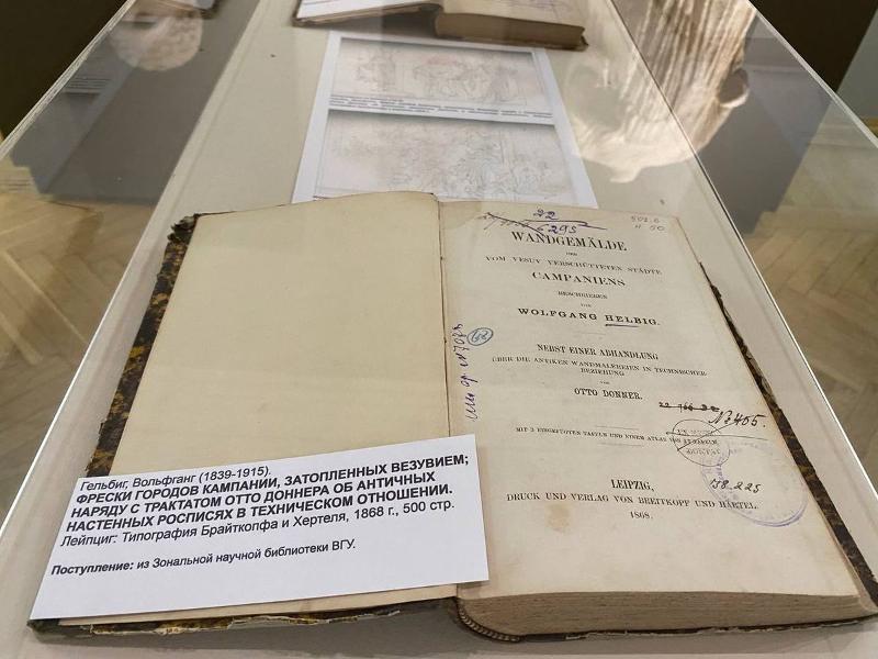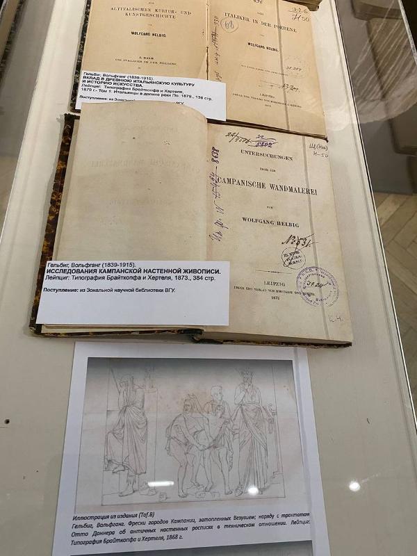 В рамках работы Круглого стола и торжественного открытия античного памятника была подготовлена книжная выставка из собрания Зональной научной библиотеки ВГУ, посвященная научным трудам Вольфганга Гельбига (1839–1915) – немецкого антиковеда, археолога, признанного знатока классического искусства. Именно при его посредничестве Музей императорского Дерптского университета в 1871–1872 годах приобрёл 31 античный памятник, в том числе, вырезанную из гробницы недалеко от итальянской Капуи фреску, изображающую всадника с копьём (так называемый сюжет «Возвращение воина»). В 1918 году, в связи с угрозой военных действий, экспонаты музея были эвакуированы в Воронеж, где они послужили основой античной коллекции художественного музея.