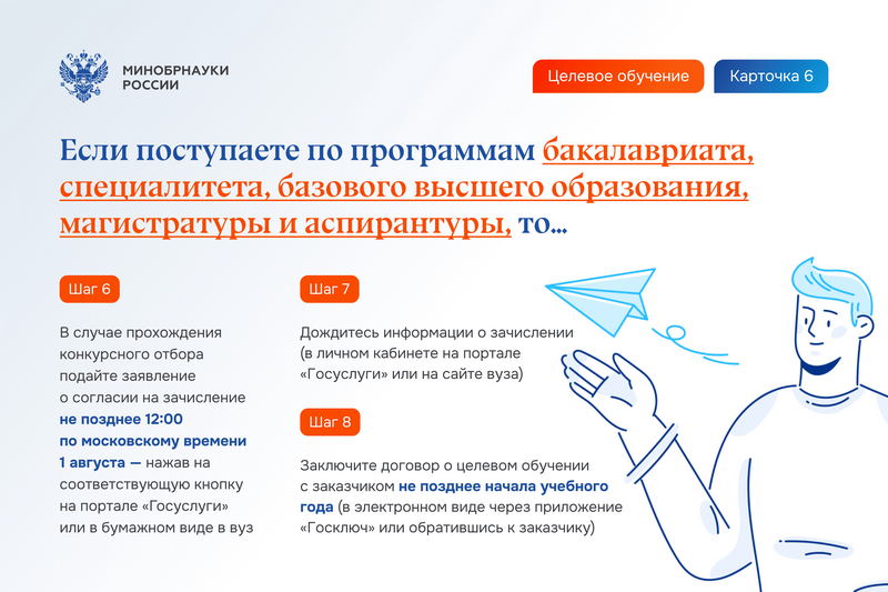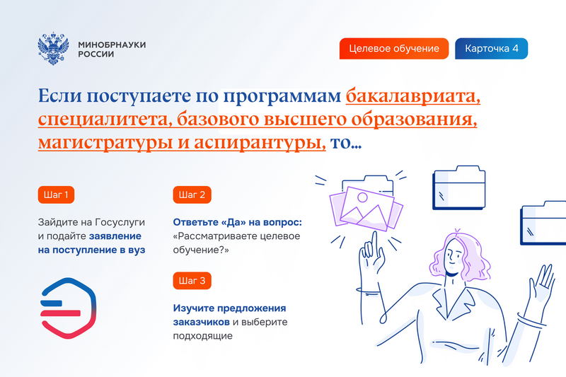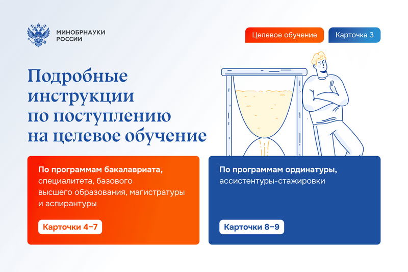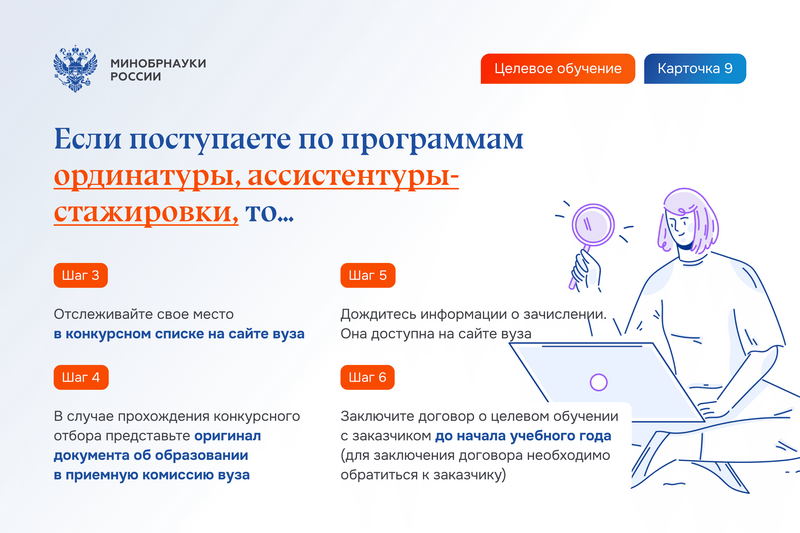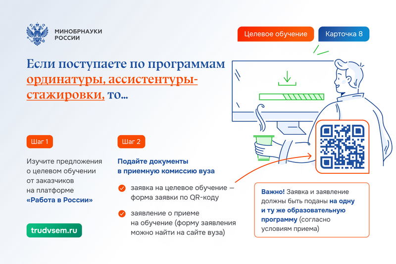 Гражданин должен самостоятельно ознакомиться с предложениями заказчиков на платформе «Работа в России» и подать заявку на заключение договора о целевом обучении в вуз в сроки, установленные в этом вузе для приема заявлений о приеме на обучение (по программам ординатуры прием документов начинается не ранее 1 июля, по программам ассистентуры-стажировки – в сроки, установленные вузом).