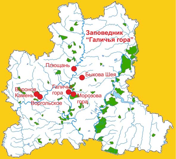 Заповедник "Галичья гора" расположен на территории Липецкой области в 45 км к юго-западу от г. Липецка. Сейчас его общая площадь составляет 234 га и состоит он из 7 разобщенных участков, разбросанных среди освоенных и распаханных пространств. Крутое правобережье Дона - Галичья гора и левобережье его - Морозова гора - лесостепные урочища в Задонском районе. Степное урочище Быкова Шея находится частично в Задонском, частично в Липецком районе, лесное урочище Плющань – в Краснинском районе, Воргольское, Копчёный Камень и Воронов Камень - в долине р. Воргол в Елецком районе.