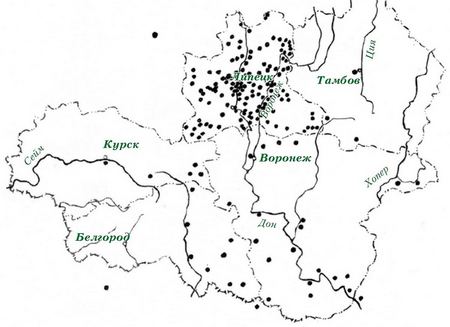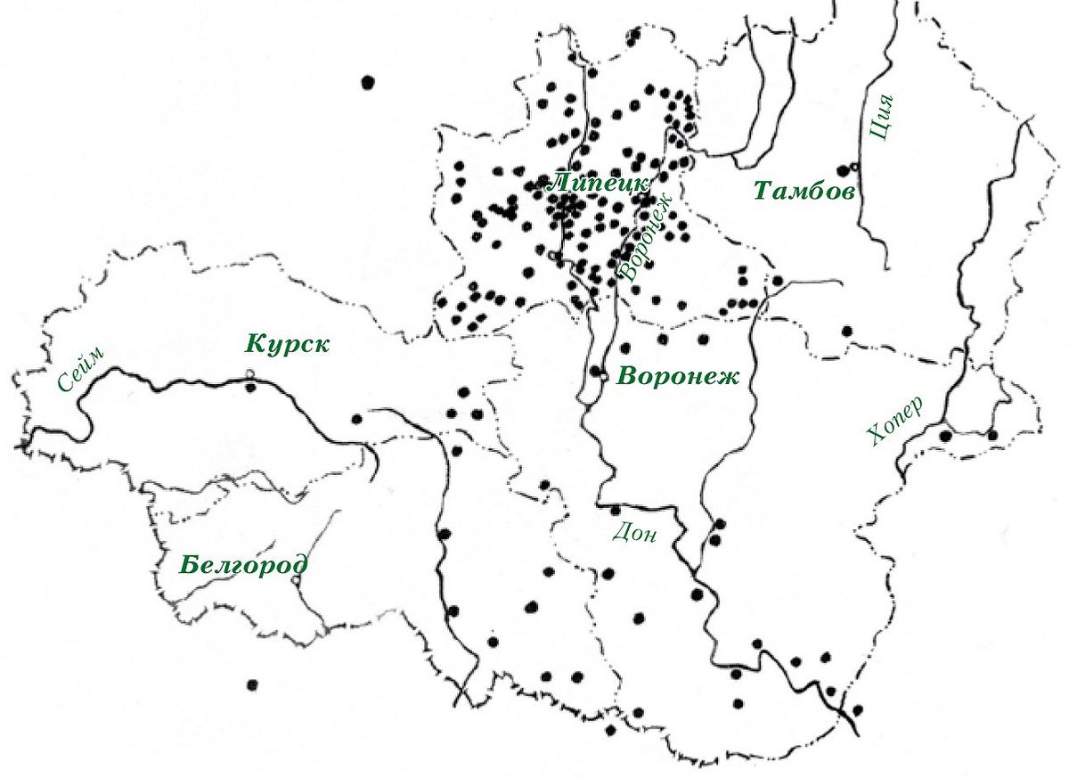 Пункты сбора беспозвоночных, хранящихся в Фондовой коллекции беспозвоночных Липецкой области и сопредельных территорий.