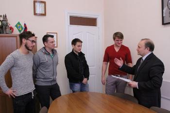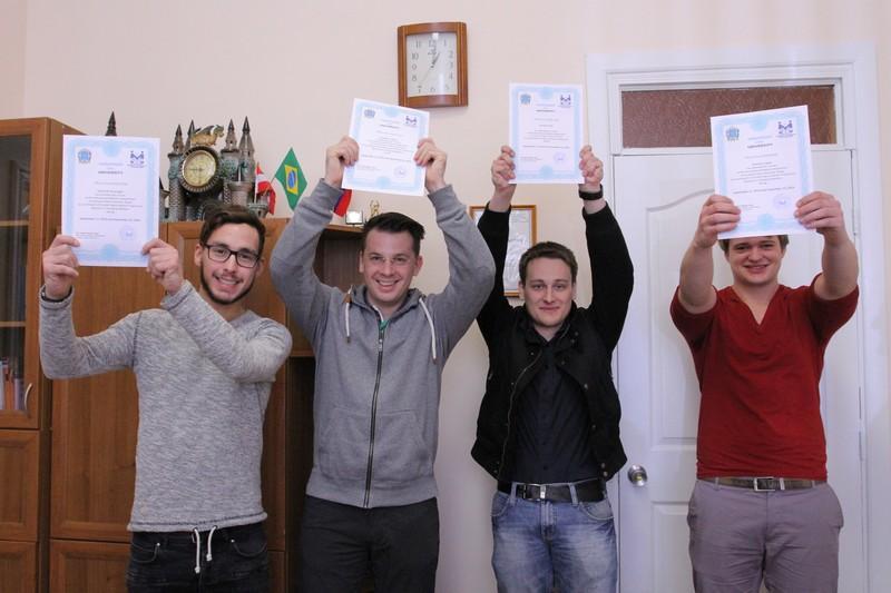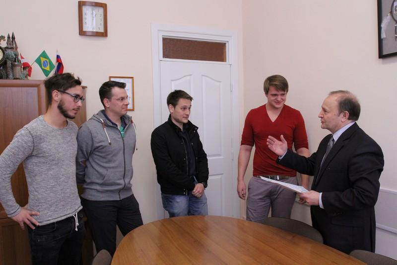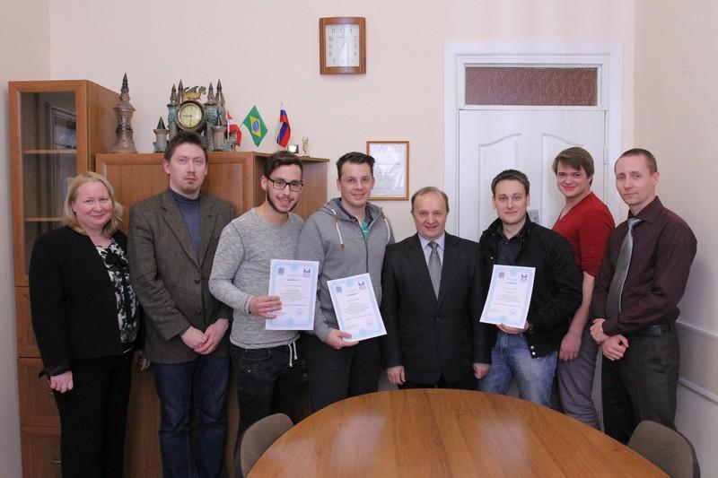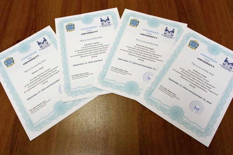 Master's degree students Andreas Kappl, Dominic Glawogger, and Günther Fragner completed their studies at VSU under the "Business in the Emerging Markets" joint master's programme agreement between Voronezh State University and FH Joanneum University of Applied Sciences (Graz, Austria). Upon the completion of the course in June 2015, the Austrian students will receive a diploma from Voronezh State University and FH Joanneum University of Applied Sciences. There are also five second-year and two first-year Russian students taking part in the programme who are currently doing their internship course in Graz.