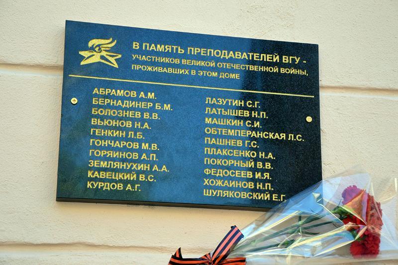 On 7 May, at the place that has become traditional for such events (19, Teatralnaya street) a ceremonial opening of a commemorative plaque dedicated to university employees who lived in this house and fought in the Great Patriotic War was held. The plaque has the names of A.M. Abramov, B.M. Bernadiner, V.V. Boloznev, N.A. Viunov, L.B. Genkin, M.V. Goncharov, A.P. Goryainov, A.A. Zemlyanukhin, V.S. Kavetskiy, A.G. Kurdov, S.G. Lazutin, N.P. Latyshev, S.I. Mashkin, L.S. Obtemperanskaya, G.S. Pashnev, N.A. Plaksenko, V.V. Pokornyi, I.Ya. Fedoseyev, N.P. Khozhainov and Ye.G. Shulyakovskiy.