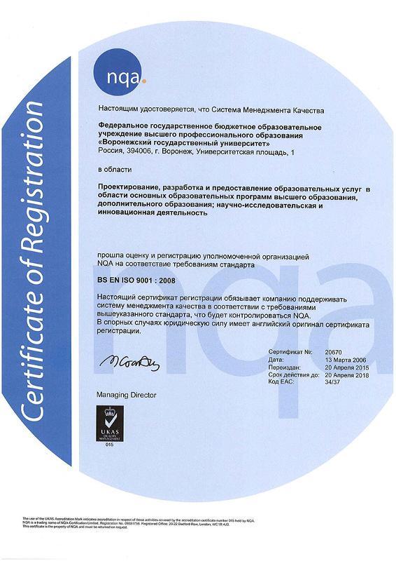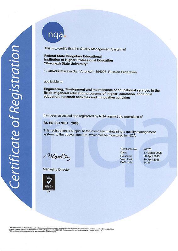 Voronezh State University system of quality management was licensed by the international company National Quality Assurance (the UK), as complying with the ISO international standard.