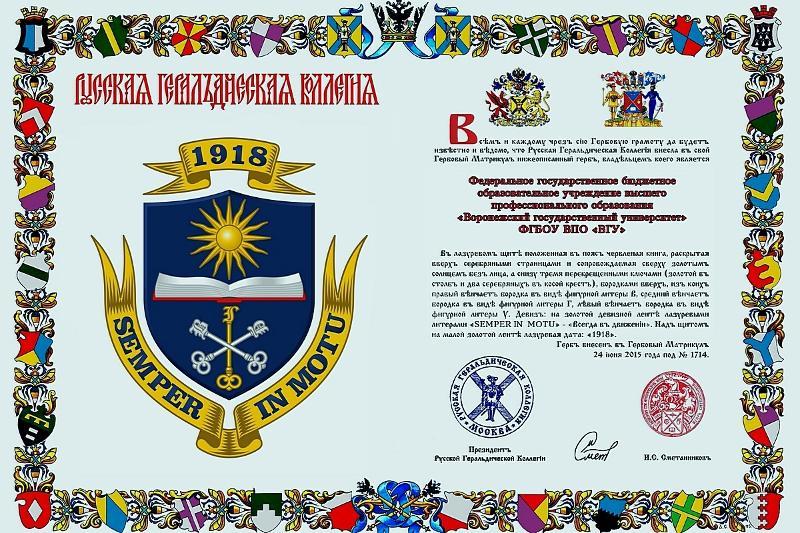 Voronezh State University got its new heraldry officially registered by the Voronezh regional heraldry society, and the new coat of arms and flag of the University were matriculated by the Russian national heraldry society. The Rector's standard was handed to the VSU Rector Dmitry Endovitsky. The certificates received by the University mean that the VSU heraldry is officially registered and recognised.
