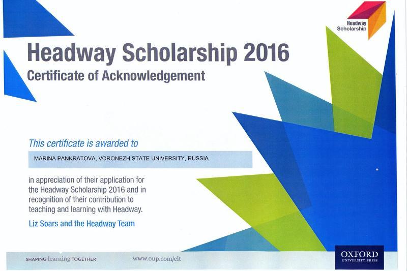 A lecturer of the Department of English language for Sciences Faculties of the Faculty of Romance and Germanic Philology of Voronezh State University Marina Pankratova has become one of the six winners of the world-known contest Headway Scholarship held annually by Oxford University Press.