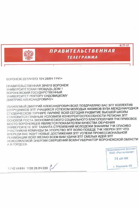 The governor of the Voronezh region sent the rector of Voronezh State University, Dmitry Endovitsky, a telegram in which he congratulated the university staff with the victory of the university students at the International Physicists' Tournament in Paris.