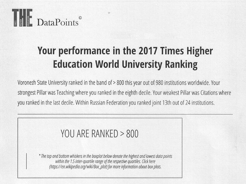 Voronezh State University was included in the rankings of the world leading universities for the first time, taking 801st position in the world’s overall list, and the 13th position among the 24 Russian universities included in the list. Times Higher Education magazine highly praised the quality of education and the level of technology commercialization at VSU. It should be mentioned, that our university is the only one in the Central Black Soil Region included in the rankings.