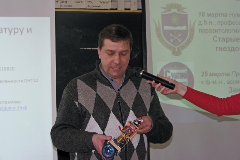 He said that there are two ways to build a robot. The first is to use ready-made construction kits. The other way is to make robots using any materials and parts available. The second approach allows inventors to demonstrate their creative abilities, as well as to save money. The lecturer demonstrated several devices for the ultrasonic measuring of temperature, humidity level and distance, and explained how to make useful tools using cheap materials. He also showed the audience a balancing robot constructed by the members of the Faculty of Applied Mathematics, Informatics, and Mechanics, and allowed the children not merely to watch the robot, but to control it themselves. The lecture was also broadcast online, so anyone could join in.
