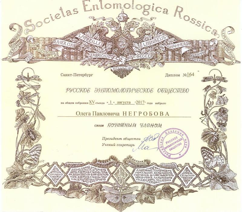 In August of the current year, the XV meeting of the Russian Entomological Society took place in Novosibirsk. It is held every five years. At the last meeting, Voronezh State University Professor Oleg Negrobov was awarded the title of an Honorary member of the Russian Entomological Society.