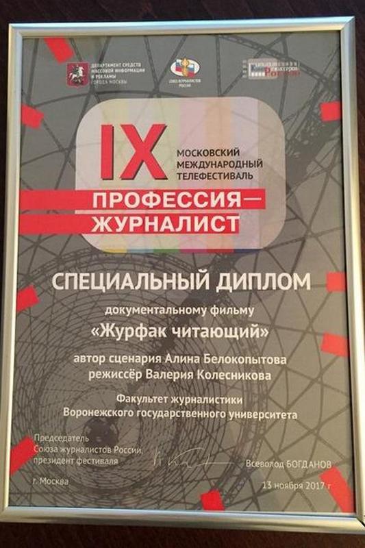 A documentary “Reading habits at the Faculty of Journalism” by a fourth year student of VSU Alina Belokopytova was awarded an honorary diploma at the IX Moscow international TV festival “Profession: Journalist”. The project was supervised by Valeria Kolesnikova, lecturer at the Faculty of Journalism. She also performed as the director and producer of the film presented at the competition.