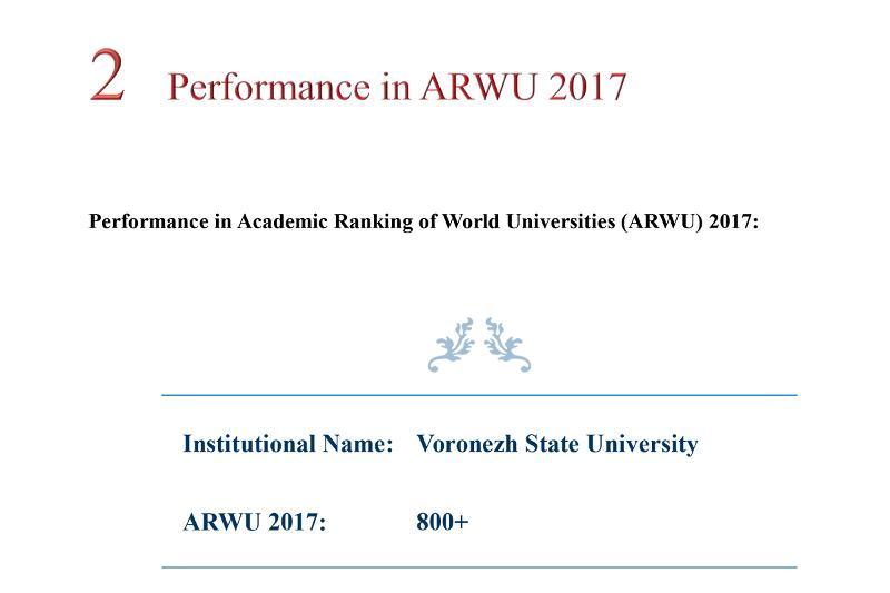 “The ranking originally included Chinese universities only, and it was not easy far the universities of other countries to get on the list. It took VSU several years to get included in the questionnaire by Shanghai Ranking Consultancy. In 2017 we also managed to get included in the ranking. The average result shows that our university takes a stable position by such parameters as the number of teachers with PhD and DSc degrees, the number of international students, the number of research fellows, and the ratio of teachers and students. We also demonstrated good results as per amount of public financing,” said Yulia Svetachova, the Assistant of the Rector in relation to international rankings.