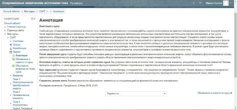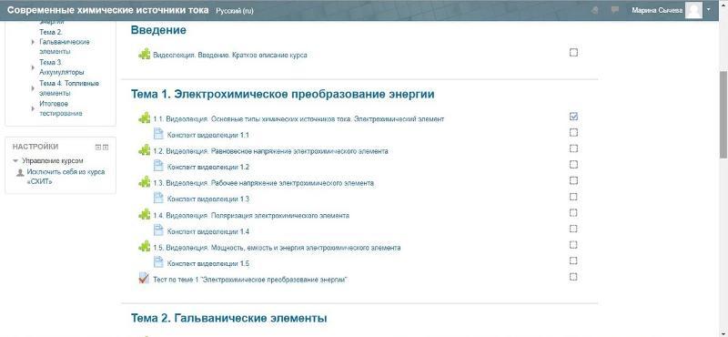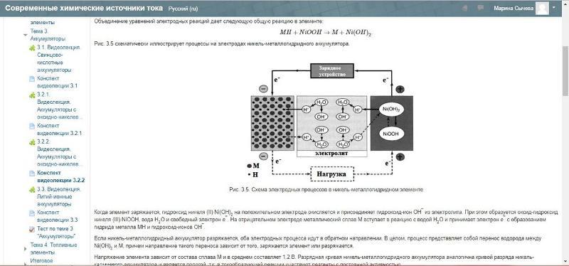 The first course “Modern chemical sources of currents” meets all the criteria for distance learning. The course has an introductory video, a series of lectures, texts, tests, and other study materials. It should be noted that one of the course’s peculiarities is the interactions between the lecturer and the audience. Students can use a special form to ask questions to the lecturer.