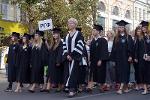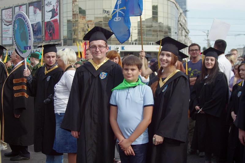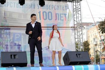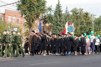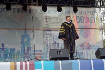 On 15 September, Voronezh State University celebrated its centenary. The celebration was combined with the celebration of the Day of the City. That day started with a ceremonial parade of VSU. A column of VSU students, graduates, and staff accompanied by the music performed by the combined orchestra of Voronezh Philharmonic Hall paraded from the administration building of the South East Railway along Revolutsia avenue. The participants of the march were wearing T-shirts with symbols of VSU and its faculties as well as official academic gowns and caps. About 1,500 people took part in the parade, including 200 international graduates who have warm memories of the years they spent at the university.