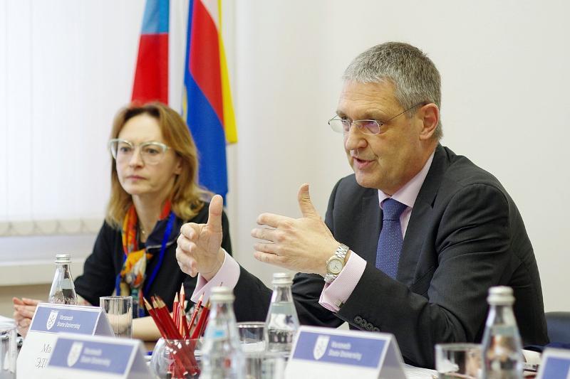 “VSU is one of the leading universities when it comes to cooperation with European partners. Now, I am representing the whole European Union and the Erasmus+ programme which is one of the most successful programmes in the Russian Federation. This year, we invested over 17 million into exchange programmes for students from Russia and the EU. Our programmes help students gain invaluable experience of academic mobility. I have been twice a member of such academic exchange programmes and I can say that they totally changed me,” said his Excellency Markus Ederer.