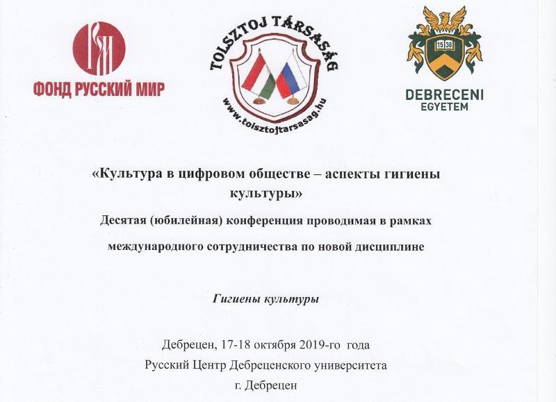 Between 17 and 18 October, an international conference “Culture in Digital Society – Cultural Hygiene” was held in Debrecen (Hungary). It was organised by the association “For Russian-Hungarian partnership” named after Leo Tolstoy, the Russian Centre of the University of Debrecen, and the Russkiy Mir Foundation.