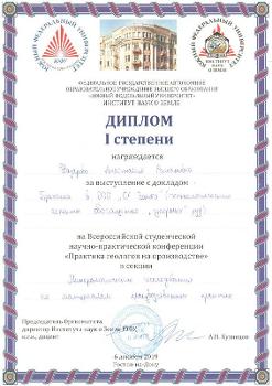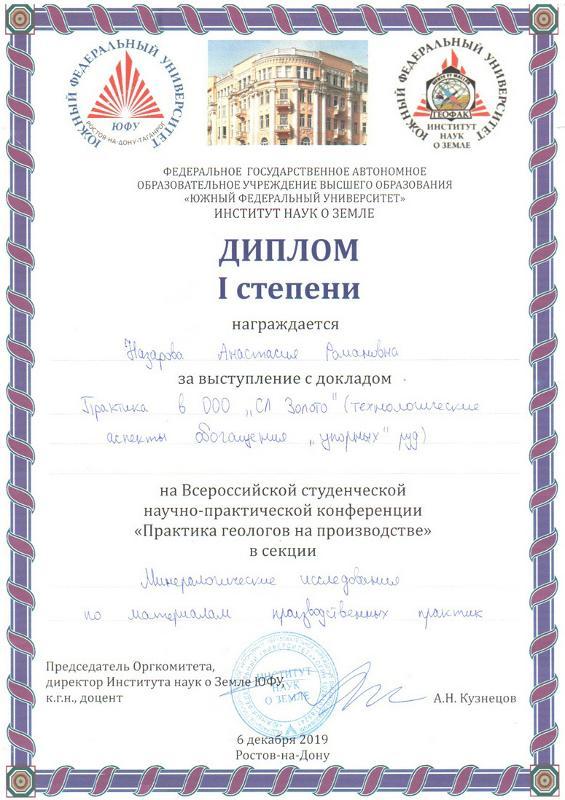 In early December, an All-Russian student scientific and practical conference “Job training for geologists” was held at the Southern Federal University. Anastasia Nazarova, a student of the Faculty of Geology at Voronezh State University, was awarded with the first degree diploma for her talk “Job training at OOO SL Zoloto (technological aspects of refractory ores benefication)”. She presented a new method of gold mining.