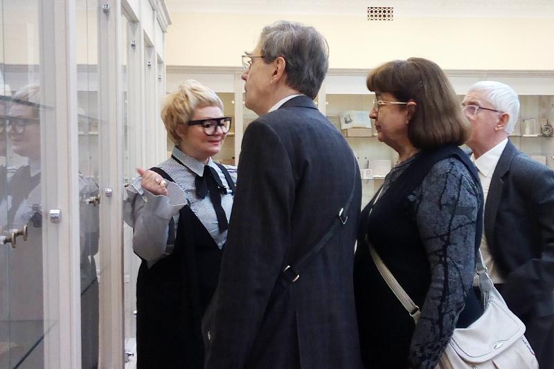 Anatoly Fomenko and his wife Tatiana, a graduate of the Faculty of Mathematics of VSU, visited the exhibitions of the VSU History Museum and the VSU Book museum. They particularly liked the 9th volume of the Description of Egypt published in France in the early 1800s.