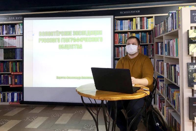On 26 March, another public lecture took place in the “Amital” bookstore as part of the project called “A Large University for a Large City”. Alexander Khaustov, engineer of the Department of Physical Geography and Landscape Optimization of Voronezh State University, talked about volunteer projects of Russian Geographical Society. He told the audience about his own experience of participating in expeditions and visiting different parts of the world with the help of Russian Geographical Society.