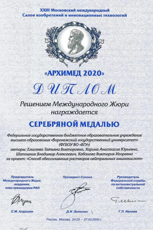 The results of the Moscow International Inventions and Innovative Technology Salon "Archimedes–2020” have been concluded. The event consisted of a number of varied events: a fair of inventions, conferences, venture fairs, contests, and presentations of national projects and technologies. Staff members of the Faculty of Chemistry of VSU, Tatiana Yeliseyeva, Anastasia Kharina, Vladimir Shaposhnik, and Victoria Kabanova, were awarded with a silver medal in the section “Inventions and innovative technologies”. The researchers proposed to use a new innovative approach to purify amino acid solutions by means of electrodialysis.