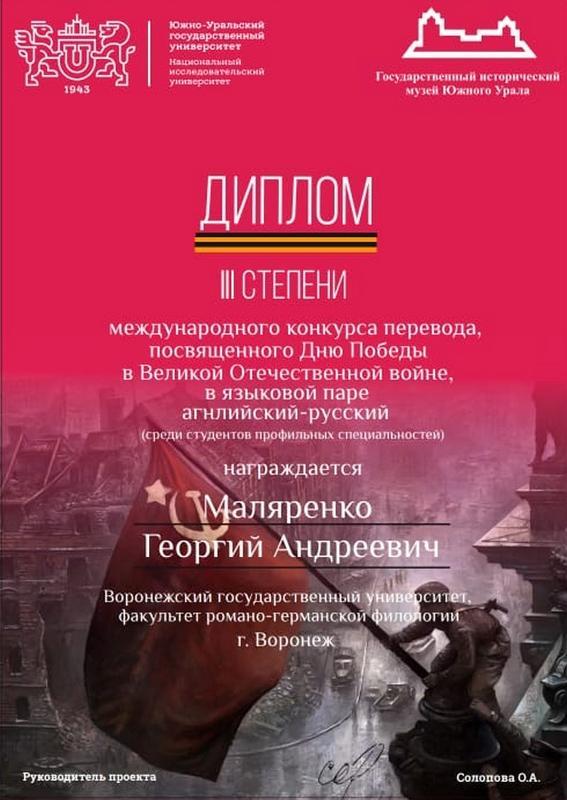 The results of the International Translation Competition dedicated to the Victory Day of the Great Patriotic War were announced. Among its participants were 653 people from different parts of Russia and neighbouring countries. As a result, a second-year student of the Faculty of Romance and Germanic Philology, Alina Pribytkova, took first place and a third-year student, Georgii Malyarenko, took third place.