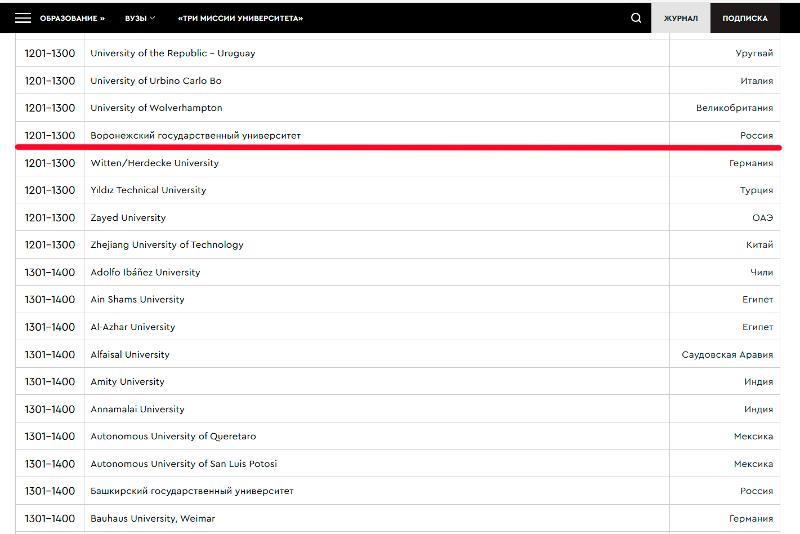 This year, the ranking included 1500 universities from 97 countries, including 101 Russian universities. Voronezh State University entered the group ranging from 1201 to 1300 in the global rating and the group ranging from 58 to 73 among Russian universities.
