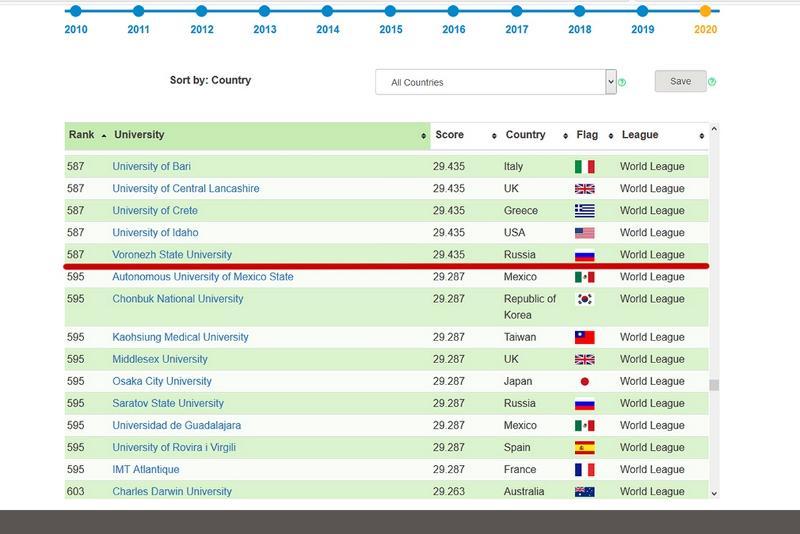 Voronezh State University took 587th position among 786 world universities and 30th position among 81 Russian universities. This is 32 positions higher than last year.