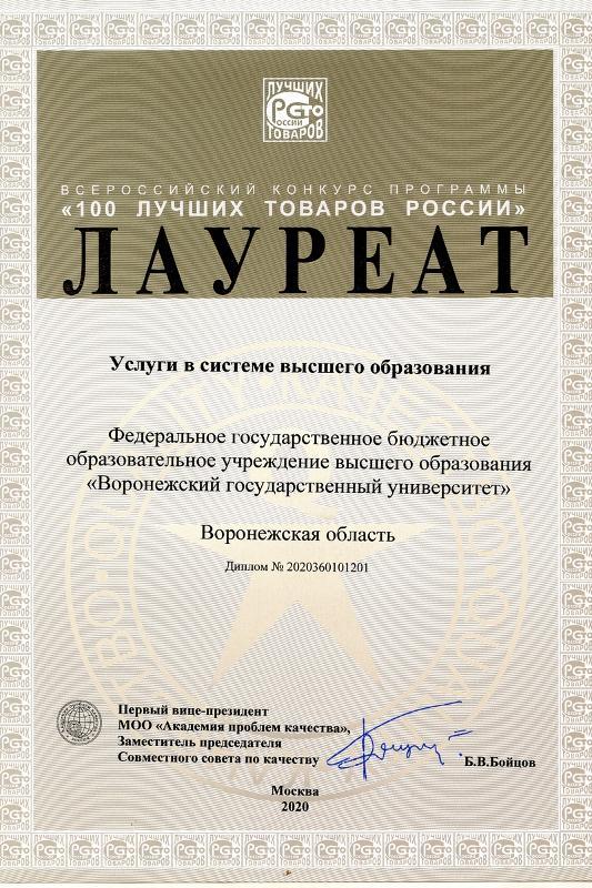 On 25 November, the award ceremony for the winners of the 23rd national competition “100 Best Russian Products” took place at the conference hall of the Centre for Standardisation, Metrology, and Examination in the Voronezh Region. Among the participants of the event were members of the Regional Quality Commission, the administration of the Centre for Standardisation, Metrology, and Examination in the Voronezh Region, and the winning companies. Voronezh State University was recognised as the best in the nomination “Higher Education Services” and was granted with the right to use the golden logo of the competition.
