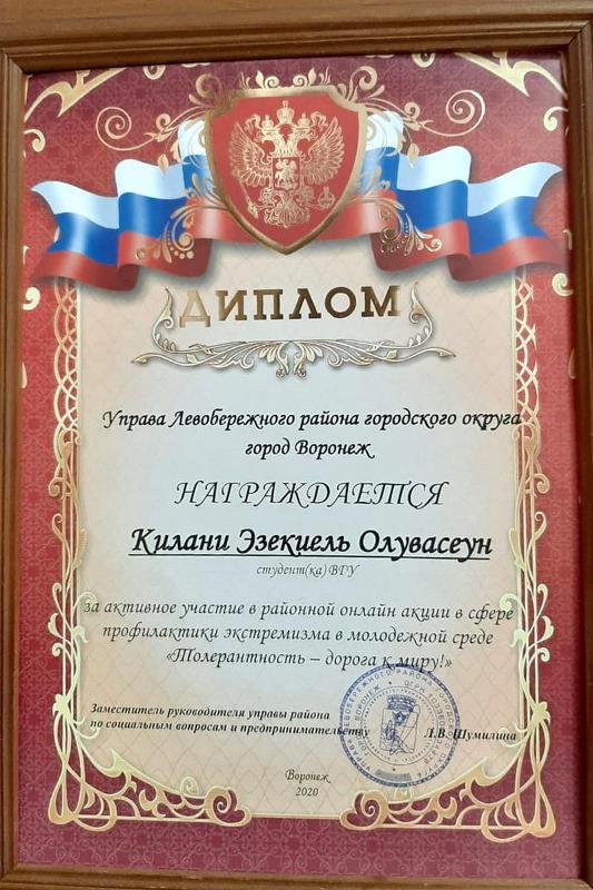 On 11 January, international students from VSU were awarded with certificates and presents for their participation in the online event “Tolerance, the path to peace!” which included the online festival “So different, but so alike”. The events organised by the Council of the Levoberezhny district of Voronezh were held in December.
