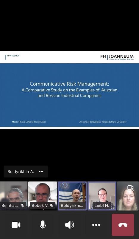 On 25 November, the defence of master’s dissertations of students Alexander Boldyrikhin, Ekaterina Krasteleva, and Maxim Semyonov was held online within the “Business in Emerging Markets” joint programme of the Faculty of International Relations of VSU and the University of Applied Sciences (Graz, Austria). The master’s students coped very well with the final task and received excellent marks, while the members of the Austrian committee noted the high level of the prepared dissertations. As usual, students defended their works in English.