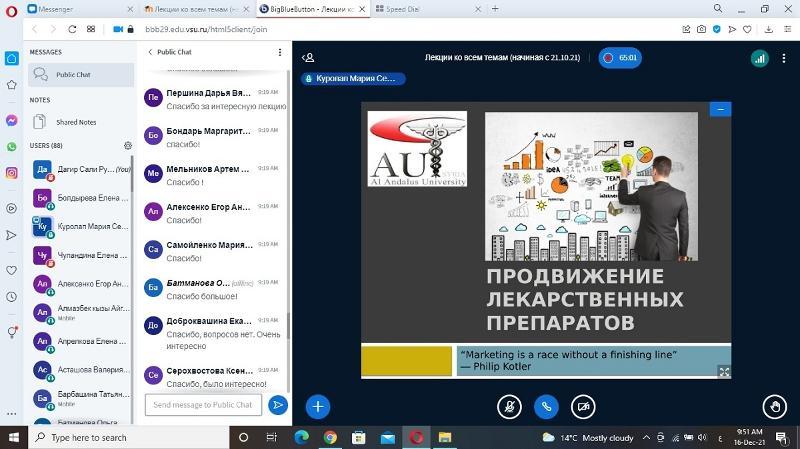 On 16 December, Sali Dagir, a lecturer from Al Andalus University (Syria), gave an online public lecture at the Faculty of Pharmaceutics. The event was held as part of the academic mobility programme. Sali Dagir conducted her PhD research at VSU at the Department of Management and Economics of Pharmacy under the supervision of the head of the department, Elena Chupandina, and in 2019 she defended her PhD thesis dedicated to the promotion of medicinal drugs on the pharmaceutical retail market.