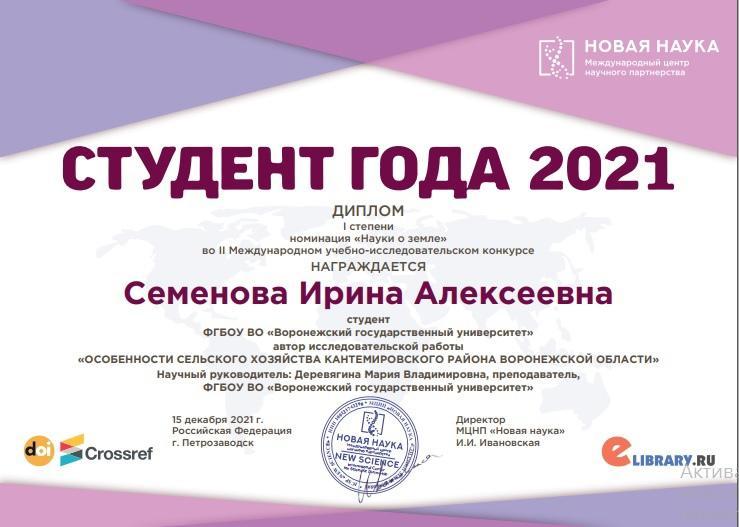 Irina Semyonova, a fourth year student from the Faculty of Geography, Geoecology, and Tourism (academic programme “Geography”, major “Social and Economic Geography”) became the winner of the international research and education contest “Student of the year 2021” (nomination “Geosciences”).