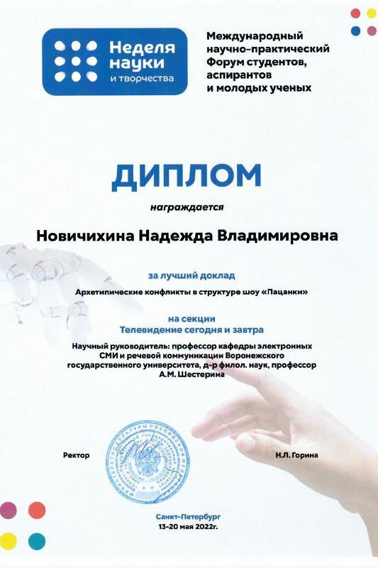 Nadezhda Novichikhina, a master’s degree student from the Faculty of Journalism, was among the winners of a large international scientific forum for students, postgraduate students, and young researchers “The week of science and creativity – 2022”. The forum is annually held at Saint Petersburg State Institute of Film and Television.
