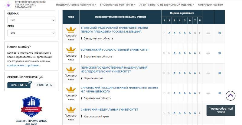 The subject ranking is an instrument of assessment of the achievements of a university in specific fields of science and professional training. It can be used to compare the education programmes of various universities. Thus, universities specialising in certain fields of study can assess their position as compared to others. Among the top three universities in the premier league in the field of study 05.00.00 “Geosciences” are Kazan Federal University, North Caucasian Federal University, and Russian State Hydrometeorological University (St. Petersburg). VSU occupies 14th position out of 20 in the premier league (close to Moscow State University which is on 11th place).