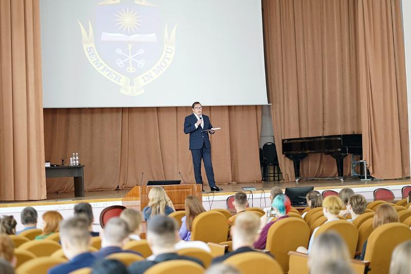 On 1 September, Dmitry Endovitsky, Rector of VSU, gave a welcoming speech for the first year students. The public lecture took place in the auditorium of the main building.