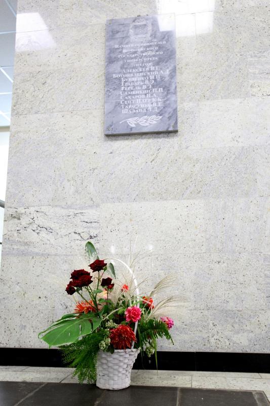 The rector told the audience about the long-term history of the university: its buildings, the Galichya Gora nature reserve and VSU Botanical Garden whose employees delivered flowers for the holiday, which were laid at the commemorative plaque dedicated to the founders of the university.