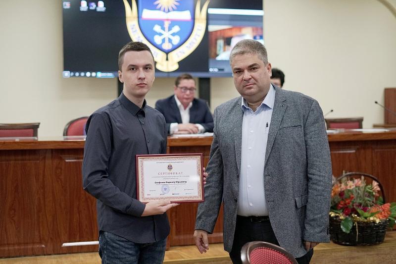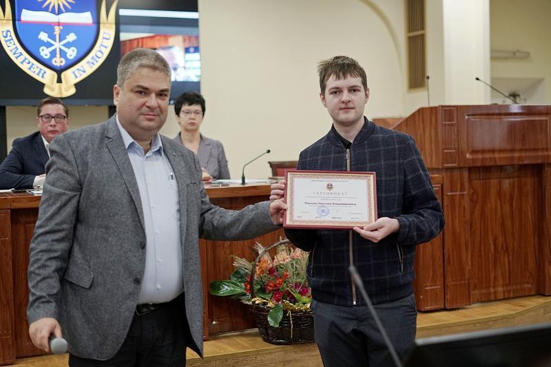 After the celebration in the honour of the Rector's councillor, the meeting of the Academic Board continued as usual. Dmitry Endovitsky awarded Natalia Belenova, the winner of the grant competition for the master’s programme lecturers, with a diploma. Alexander Krylovetsky, Dean of the Faculty of Computer Sciences, awarded three winners of the competition for the scholarship named after Eduard Algazinov. They were Nikita Paukov, Kirill Skofenko, and Evelina Steshenko.