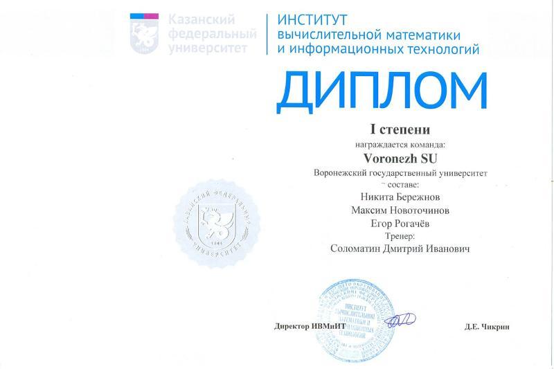 On 18 December, a team of students from the Faculty of Computer Sciences of VSU took part in the 17th Open Team Programming Olympiad of Kazan Federal University. The team of our university consisted of Nikita Berezhnov, Maxim Novotochinov, and Yulia Shishko. According to the results of the event, VSU students became winners and took first place.