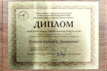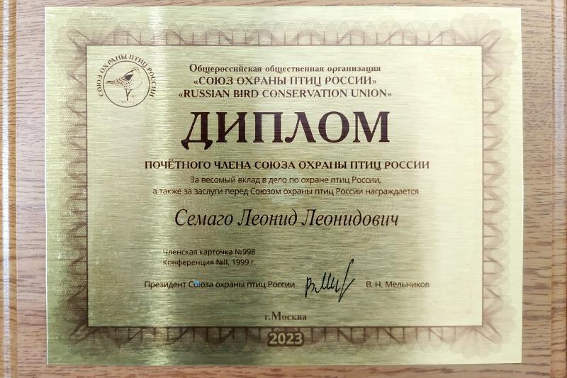 Professor Aleksandr Numerov was awarded a diploma for his significant contribution to bird conservation in Russia and for serving the Russian Bird Conservation Union. He also received a diploma in the name of Leonid Semago (1928-2008), a well-known naturalist writer, teacher, honorary resident of Voronezh. Leonid Semago worked as associate professor at the Department of Vertebrate Zoology (now the Department of Zoology and Parasitology) of Voronezh State University for many years.