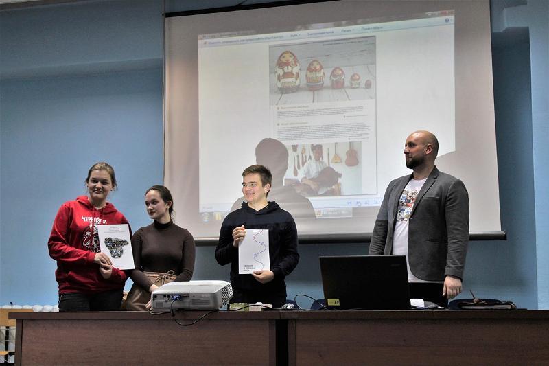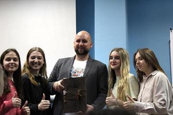 Students of secondary vocational education, who asked the guest the most interesting questions, received a thematic guide to the Voronezh region as a gift. Among them were: representatives of the "Tourism” programme Angelina Dukhina and Andrey Chichaev and a representative of "Rational Use of Environmental Complexes" programme Polina Butyrina. The students also appreciated a copy of the author's version of the guide with a leather cover, with the smell of the Voronezh region and an ancient belemnite from the Cretaceous period.