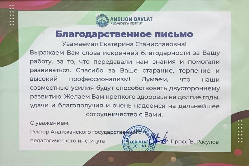 During the plenary session, she gave a report dedicated to “Metal oxide/silicon heterostructures as promising structures for creating solar cells”. The co-authors of this projects were T.V. Svistova, N.N. Kosheleva, and M.B. Rasulova. Ekaterina Rembeza also gave lectures dedicated to the “Physics of thin films” for bachelor students from the Faculty of Physics of Andijan State University and Andijan State Pedagogical Institute.