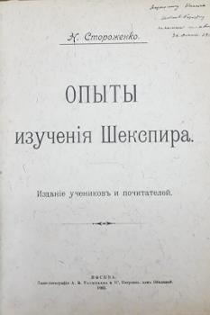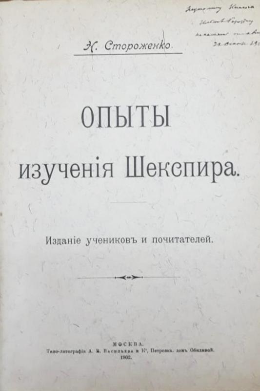 Ilya Borozdin's mentor and friend was Professor Nikolai Storozhenko, a prominent Shakespeare scholar, Vice-President of the New Shakespeare Society in London, professor at Moscow State University, and curator of the library at the Rumyantsev Museum.