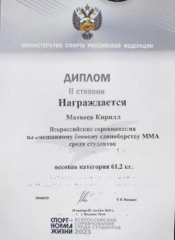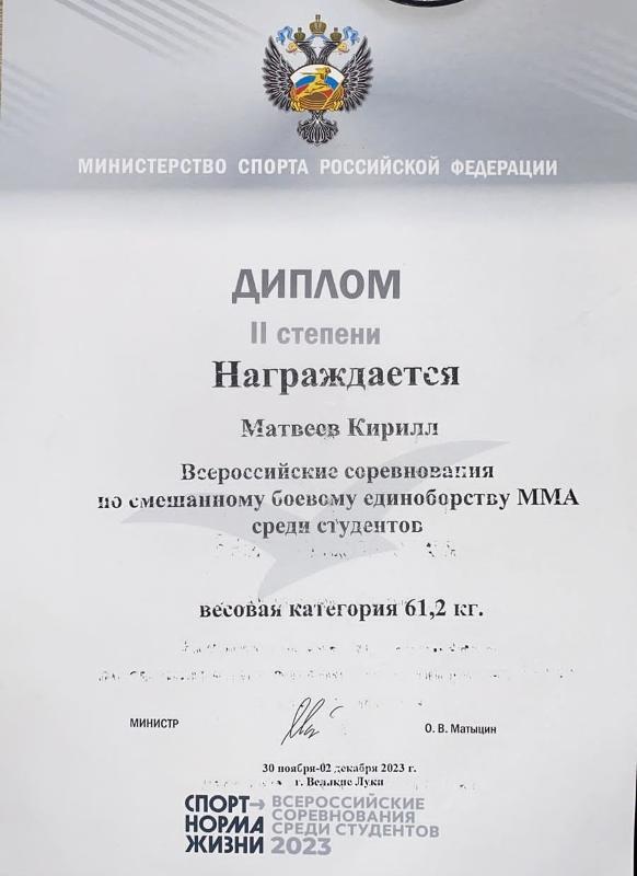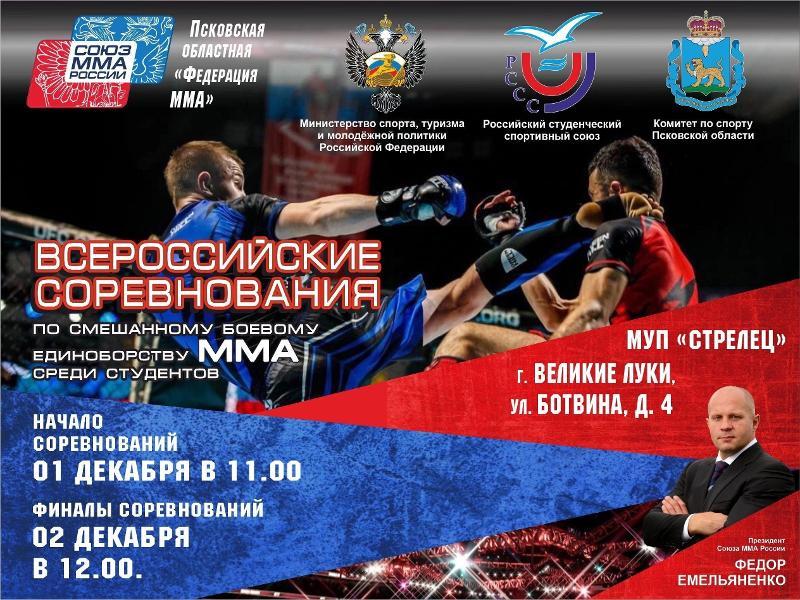 Between November 30 and December 2, 2023, the National Tournament in Mixed Martial Arts among students was held in the Velikiye Luki. About 100 athletes took part in the competition: they were undergraduate and postgraduate university students aged 18 to 25. The athletes represented all the regions of Russia. The winners of the competition now have the right to participate in the Russian MMA Cup in 2024 without selection, as well as achieve the master of sport of the Russian Federation qualification.