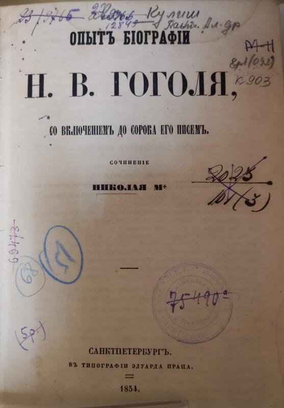 Panteleimon Kulish (1819–1897) was the first to collect materials about the life and writings of Nikolai Gogol. In 1854, he published the book “The Experience of the Biography of N.V. Gogol” (Saint Petersburg, 1854). Then, some of Gogol's acquaintances were still alive and this book reflected their attitude to the writer. The book was supplemented by the work by Alexey Tarasenkov “The Last Days of the Life of N.V. Gogol”. The second edition of the biography published in 1856 contained three times more materials.