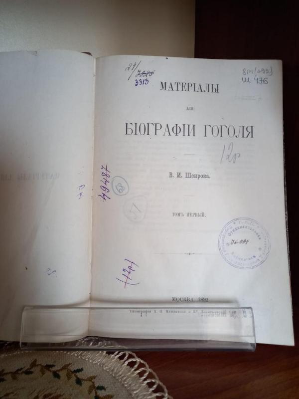 Vladimir Shenrok (1853–1910) is a Russian writer and historian of literature. His literary research, which he conducted nearly all his life, was devoted to the study of Gogol's life and works. Vladimir Shenrok’s book “Materials for the Biography of Gogol” (Moscow, 1892) can be seen at the exhibition.