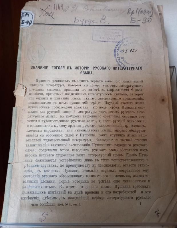 Another interesting exhibit is the book by Nestor Kotlyarevsky “Nikolai Gogol, 1829–1842: an Essay on the History of the Russian Novella and Drama” (Petrograd, 1915). Nestor Kotlyarevsky was a publicist, literary critic, and the first director of Pushkin’s House. He tried “to reconstruct the story of the mysterious soul of the artist as fully as possible and to explore in more detail the connections between Gogol's works and works of his contemporaries and predecessors”. The author evaluated the works by Nikolai Gogol in the context of the history of Russian literature and criticism and this is what makes the Kotlyarevsky's book of value.