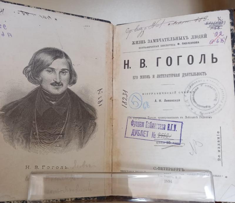 The exhibition also presented the book by Alexandra Annenskaya “N.V. Gogol. His Life and Literary Activities” (Saint Petersburg, 1894), which was published in the series “Life of Outstanding People” by Florenty Pavlenkov in 1894. The book traces the life of the writer from his childhood and adolescence until his death. Alexandra Annenskaya (1840–1915), the author of the essay, was a teacher and a famous children's writer of the late 19th – early 20th century.